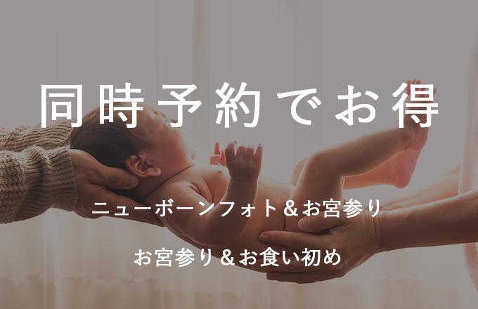 平日に撮影をご予約いただくと、撮影料金から2,000円割引いたします。また、「ニューボーンフォトとお宮参り」や「お宮参りとお食い初め」など、二つの撮影を同時にご予約いただくとお得になる「セットプラン」もご用意しております。詳しくは「料金とサービス内容」をご覧ください。